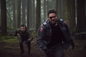 Arrow — « The Return » — Image AR314B_0005b — Pictured (L-R): Stephen Amell as Oliver Queen and Manu Bennett as Slade Wilson — Photo: Cate Cameron/The CW — é 2015 The CW Network, LLC. All Rights Reserved.